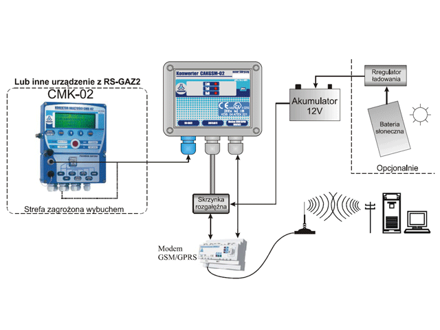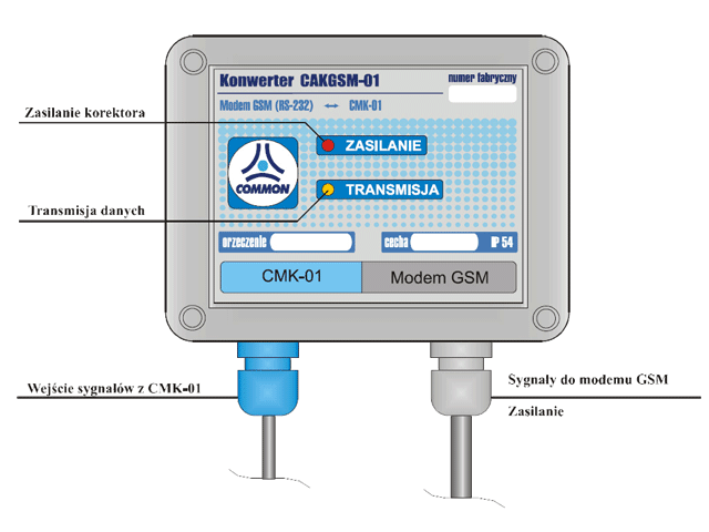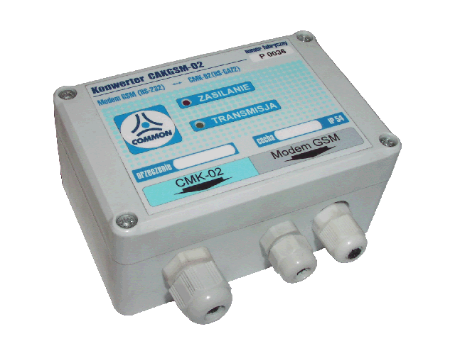Konwerter przeznaczony jest do współpracy z modemami GSM/GPRS np. z modułem transmisji danych CMT/GSM-01 produkcji COMMON S.A. Głównym zadaniem urządzenia CAKGSM-02 jest konwersja sygnałów komunikacyjnych ze standardu RS-GAZ2 na standard RS232. Pośredniczy też w zasilaniu modemu. Energia potrzebna do zasilania pochodzi z zewnętrznego akumulatora ołowiowego o napięciu 12V, który nie wchodzi w skład wyposażenia podstawowego dostarczanego przez producenta. Istnieje możliwość podłączenia do akumulatora odpowiednio dobranej baterii słonecznej z układem regulatora ładowania. Taki zestaw zapewnia długoterminową bezobsługowość stacji oraz ciągłą gotowość do zapewnienia zasilania dla korektora i modemu GSM/GPRS na czas transmisji danych.